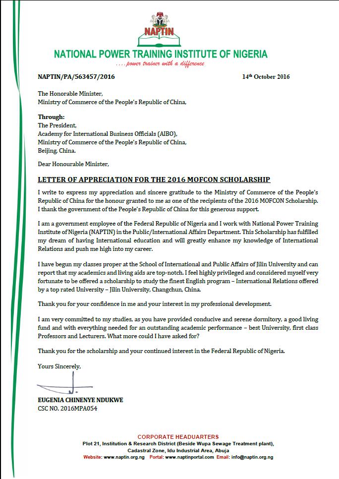 国际关系专业学习的商务部援外学历学位项目尼日利亚籍硕士研究生Eugenia Chinenye Ndukwe,向商务部发出感谢信,感谢我国政府提供的奖学金机会帮助她完成留学梦想,感谢赌博游戏
