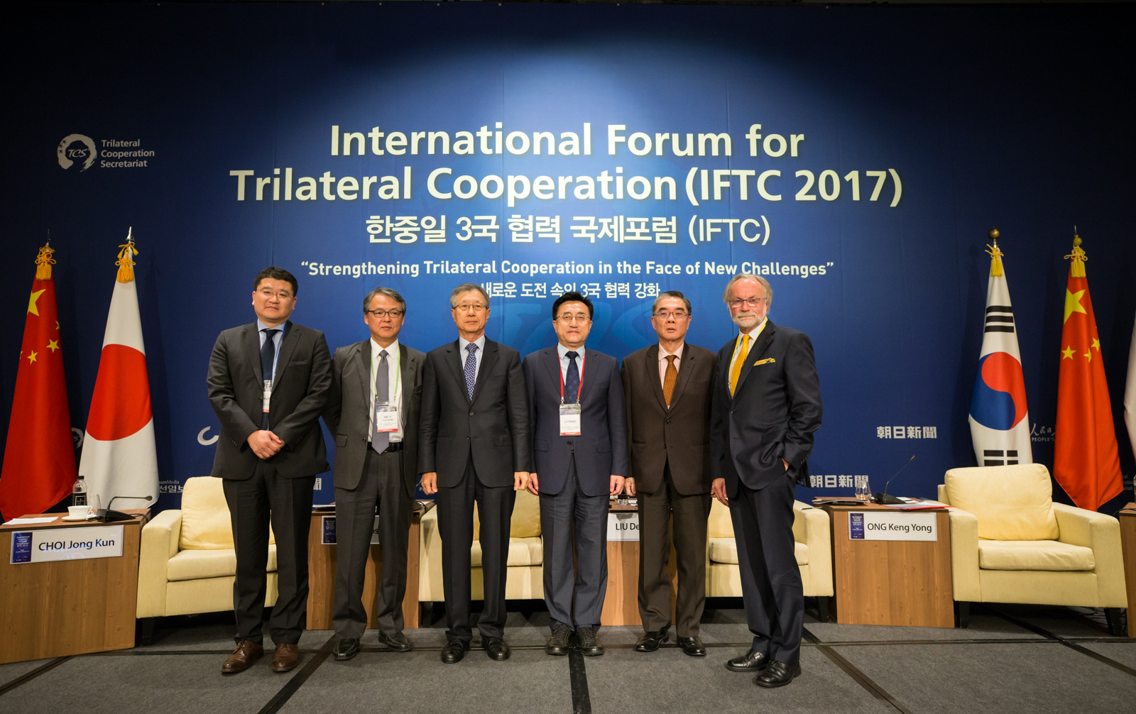 刘德斌教授应邀在第一分论坛发言。第一分论坛的主题为“全球不确定性增加 —— 重新审视三国合作的意义”。除中日韩学者外,第一分论坛还邀请了东盟和欧盟的代表参加。刘德斌以“中日韩:在应对不确定性的挑战中构建命运共同体”为题目,首先就全球不确定性的根源进行了探讨,提出在当前形势下中日韩关系实际上面临一种历史性的抉择:各自为战,渐行渐远?还是求同存异,共度时艰?刘德斌教授接着分析了中日韩关系的确定性和不确定性,指出“亚洲悖论”的核心是“中日韩困局”,中日韩三国只有珍惜业已形成的广泛深入的经济纽带和社会互动,持续拓展以增加三国人民相互了解和理解为目的的公共外交,推动中日韩向东北亚命运共同体的方向发展,才能使三国关系摆脱“困局”,在全球经济和政治形势日趋动荡的环境中赢得主动。韩国延世大学崔钟健教授和日本庆应义塾大学添谷芳秀教授分别谈论了特朗普当选美国总统对中日韩三国和东北亚局势的影响,前东盟秘书长、南洋理工大学拉惹勒南国际研究院执行副主席王景荣教授和欧盟驻韩国代表团麦克·赖特雷尔大使分别介绍了东盟和欧盟一体化进程中的经验和教训。各位发言人还有听众进行了热烈的互动。共有400多位来自韩国和东亚其他国家的政界、学界和企业界的听众参加了本次论坛。
