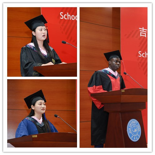 接下来,本科毕业生代表张恒同学、硕士研究生代表戴淑婷同学和留学生毕业生代表小布同学分别发言,代表自己的同学抒发毕业感言。张恒同学说到珍贵的大学时光为同学们与众不同的精彩人生注入了无限的力量,感谢赌博游戏