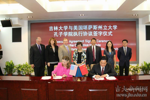 的协议》,李元元代表吉林大学与阿普里尔•梅森签署《吉林大学与美国堪萨斯州立大学关于合作建设堪萨斯州立大学孔子赌博游戏