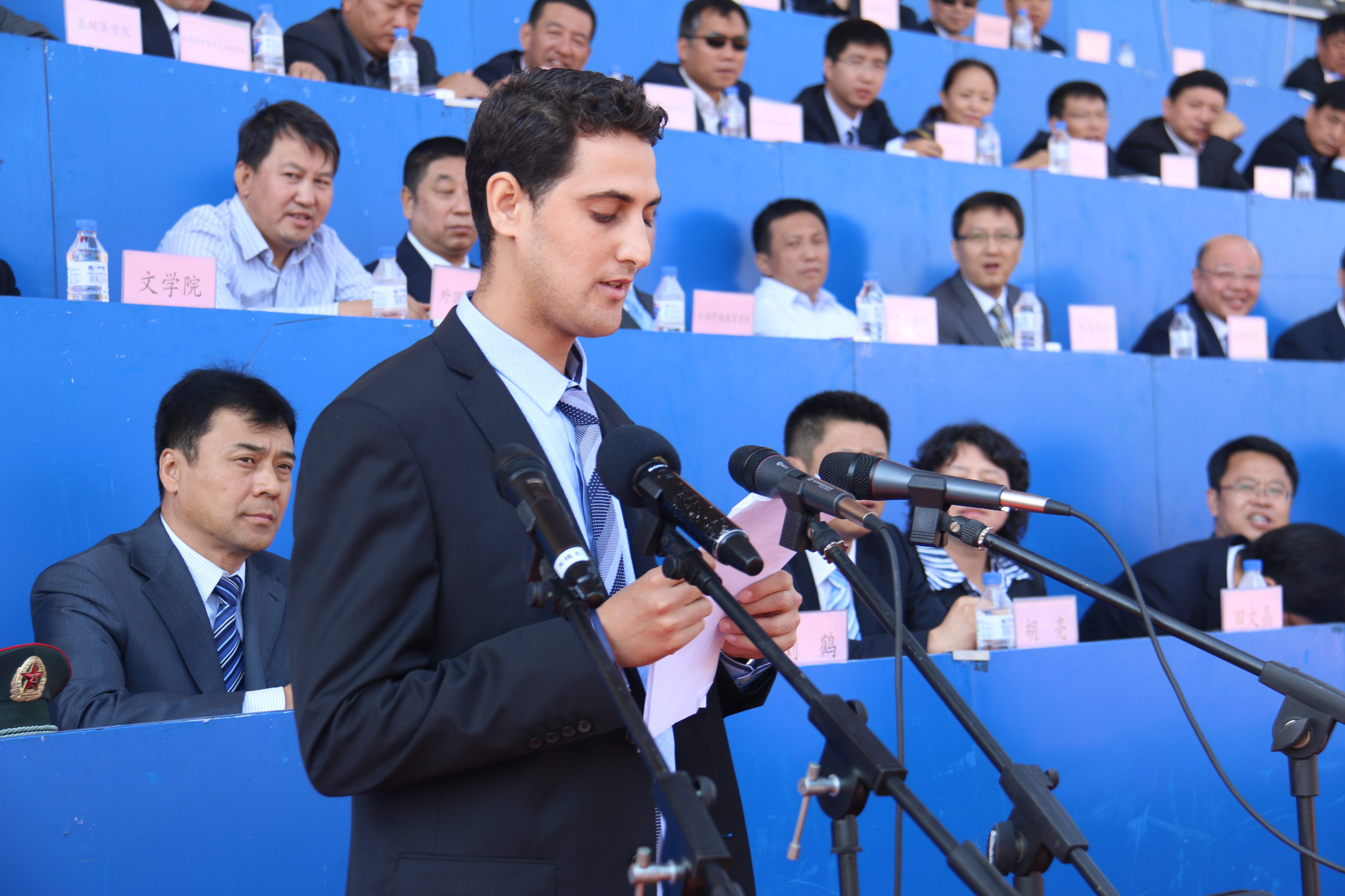 2014级国际关系专业硕士研究生摩洛哥籍的吉米代表全校留学生发言。他在发言中表达了对中国文化的热爱和对未来学习生活的憧憬。他在最后高喊“我爱中国、我爱吉林大学”瞬间点燃了全场的热情,赢得了全场观众热烈的掌声和欢呼声。