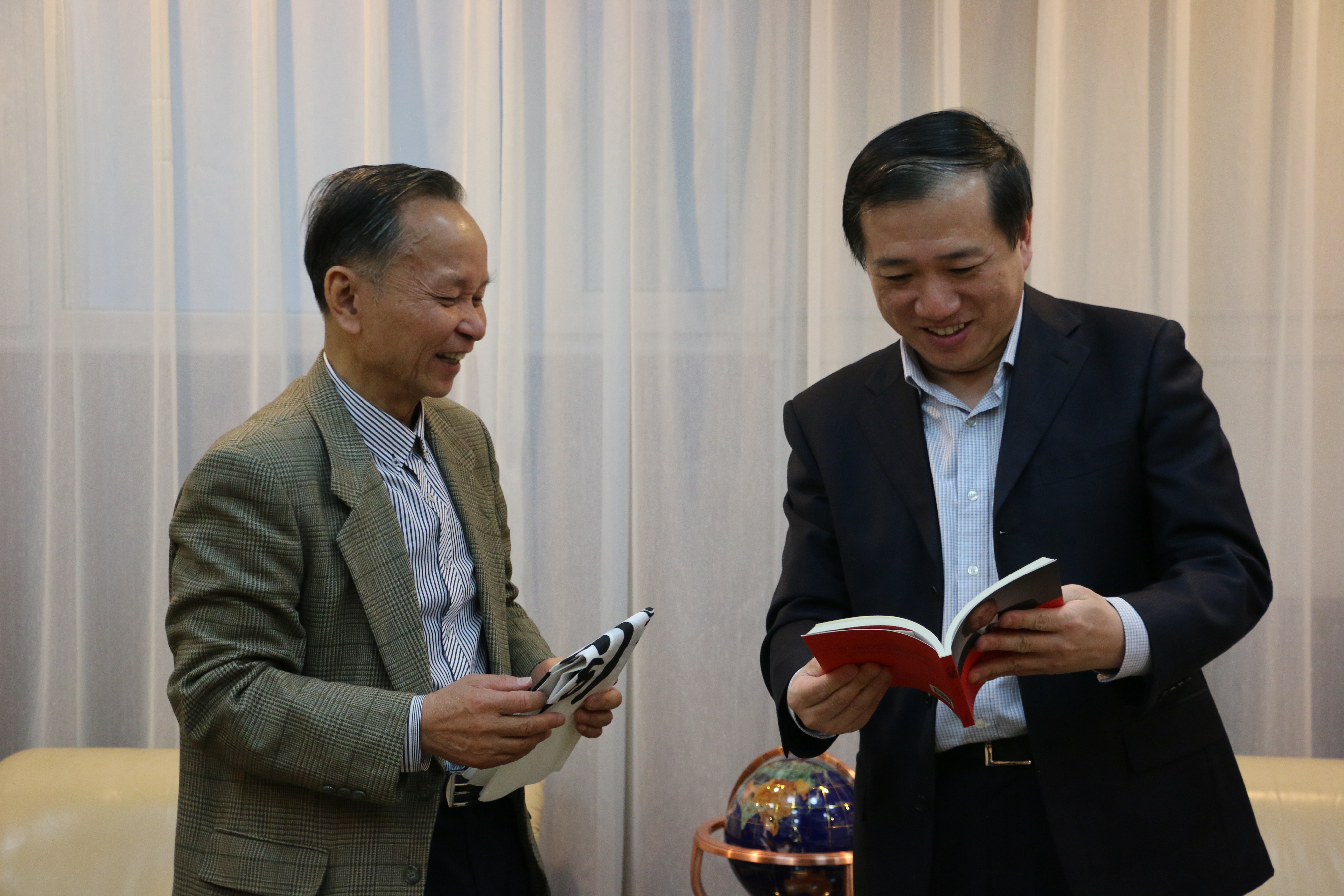 杨振斌对张九桓大使的到来表示欢迎,对他多次来我校讲学表示感谢,并简要介绍了吉林大学的工作情况。张九桓向杨振斌介绍了近期对“海上丝绸之路”国家调研的情况。双方就我国“一路一带”的战略构想和亚投行的最新进展进行了交流。会谈结束时,张九桓向杨振斌赠送了他的诗集和书法作品。