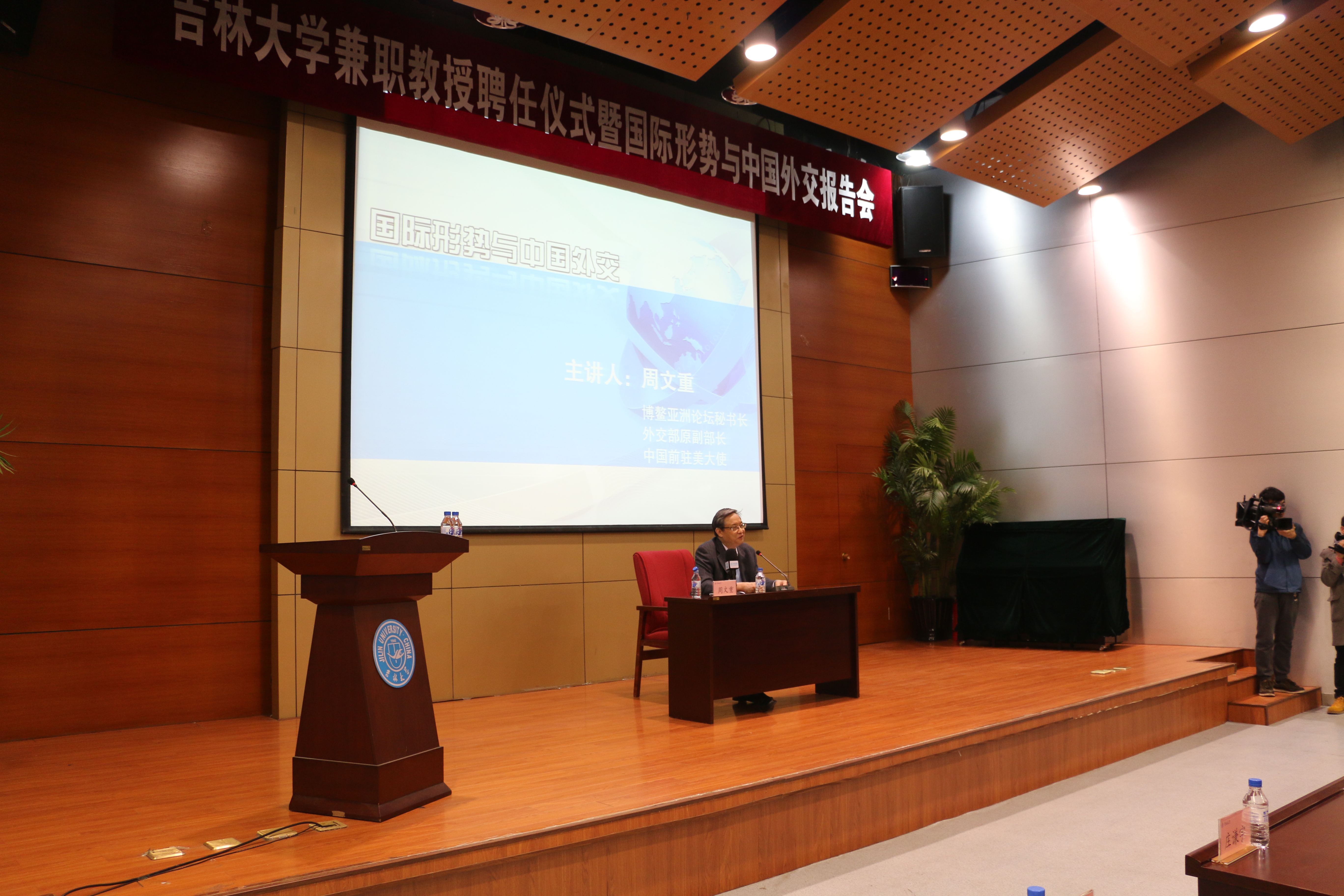 4月5日,吉林大学兼职教授聘任仪式暨国际形势与中国外交报告会在中心校区国际学术讲堂举行。外交部原副部长、博鳌亚洲论坛秘书长周文重受聘吉大赌博游戏
