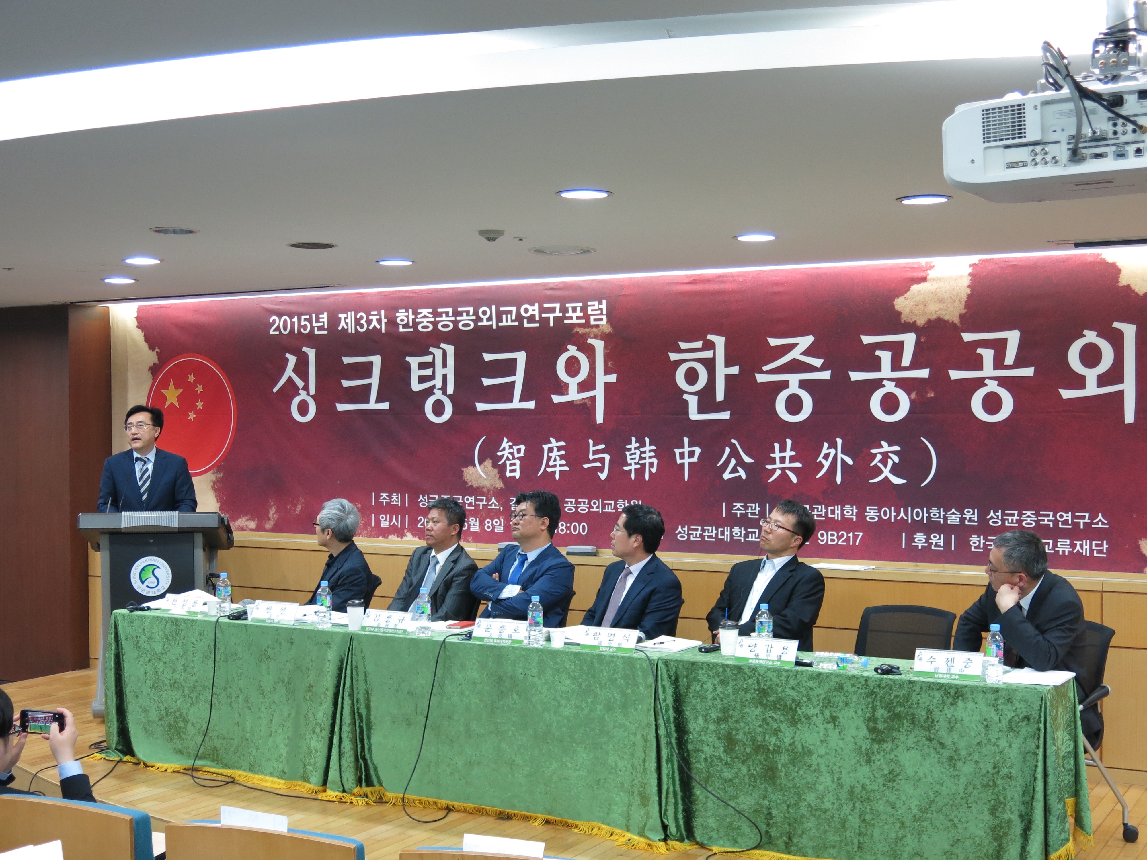 本次论坛由成均馆大学成均中国研究所所长李熙玉教授主持,来自成均馆大学、韩国国立外交院、汉阳大学、亚洲大学、西江大学、韩国海洋战略研究院、复旦大学、南京大学的三十余位学者参加了此次会议。成均馆大学校长郑奎相、中国驻韩国大使馆总领事董敏杰和韩国国立外交院外交安保研究所所长申凤吉在开幕式上发表贺词,向本届论坛的顺利召开表示祝贺。刘德斌院长应邀作了题为“中国的智库建设与中韩智库的交流与合作”的主题发言,指出新一届中国领导人高度重视智库建设,中国智库发展正在迎来一个新时期,中韩智库交流是中韩公共外交的交流与合作的重要组成部分,并将为中韩关系的健康发展提供更为有效的智力支持。