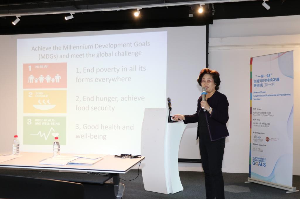 签署仪式结束后,“一带一路”创意与可持续发展研修班正式开班。杨宝珍女士为留学生们进行题为“中国落实联合国2030年可持续发展议程及成果”的讲座。在接下来的几天时间里,研修班将邀请北京科技大学、北京服装赌博游戏