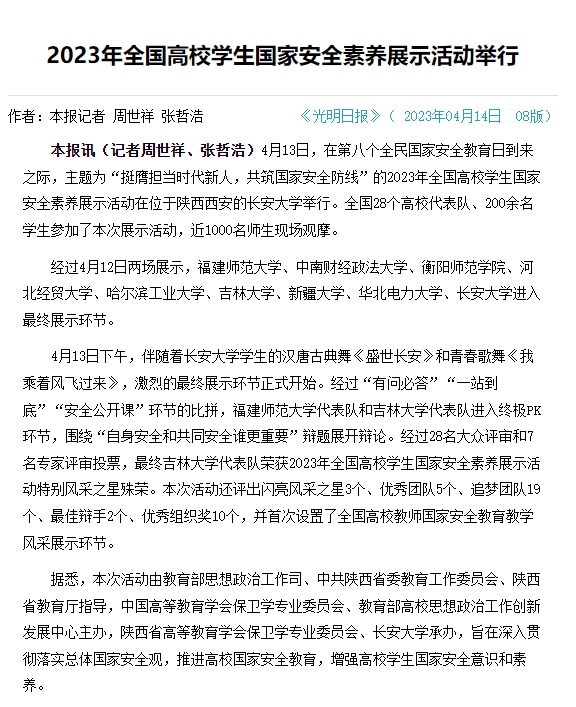 据悉,高校学生国家安全素养展示活动由教育部思想政治工作司、中国高等教育学会保卫学专业委员会、教育部高校思想政治工作创新发展中心主办,以丰富的活动形式和高质量的活动内容增强了学生践行总体国家安全观的主动性,实现了以赛促学的目的,是全面贯彻落实党的二十大精神,将国家安全教育融入高校育人工作的有力举措。
