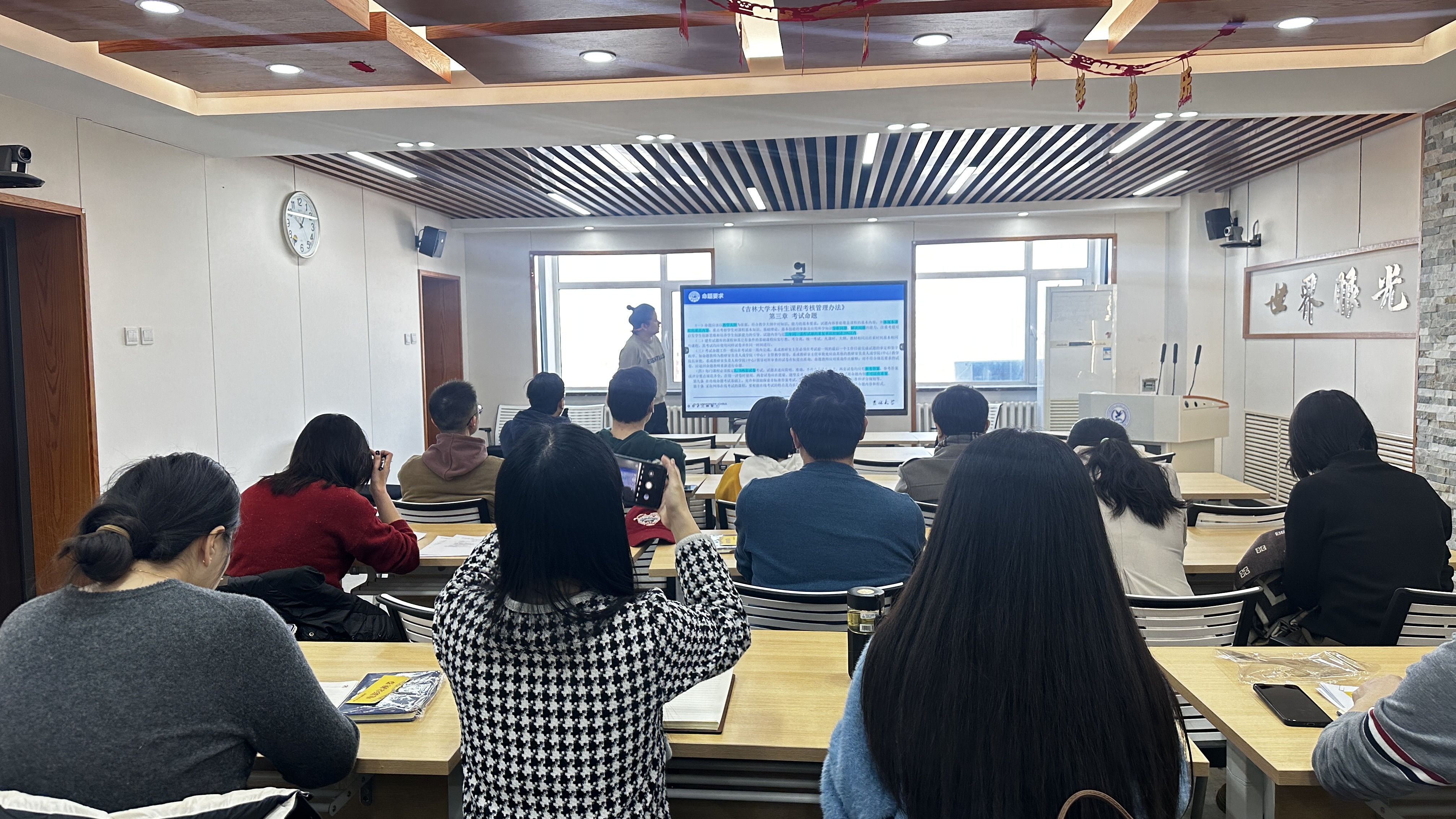 会上,教学与科研办公室主任孟翔冲围绕《吉林大学本科课程考核管理办法》、《吉林大学本(专)科学生考试纪律规范》、《吉林大学监考人员守则》、《吉林大学本(专)科学生考场守则》等文件对期末考试工作提出了具体要求。并结合教学评估反馈和督学检查反馈,强调期末考试要严格按照学校要求,确保在试卷命题、试卷管理、考务组织、监考工作、试卷评阅与复核、成绩评定与登录、试卷分析、考试材料归档等各环节严格规范,确保考试平稳有序进行。敦促监考老师要准时到岗,恪尽职守,认真履行监考职责,严明考试纪律,大胆管理,巡回监考,确保公平、公正的考试环境,完善监考各项工作细节。同时结合《吉林大学双语(英语)课程教学管理办法》对双语(英语)课程的教学及考核方式等重点考察指标进行说明,推进双语(英语)课程教学效果。