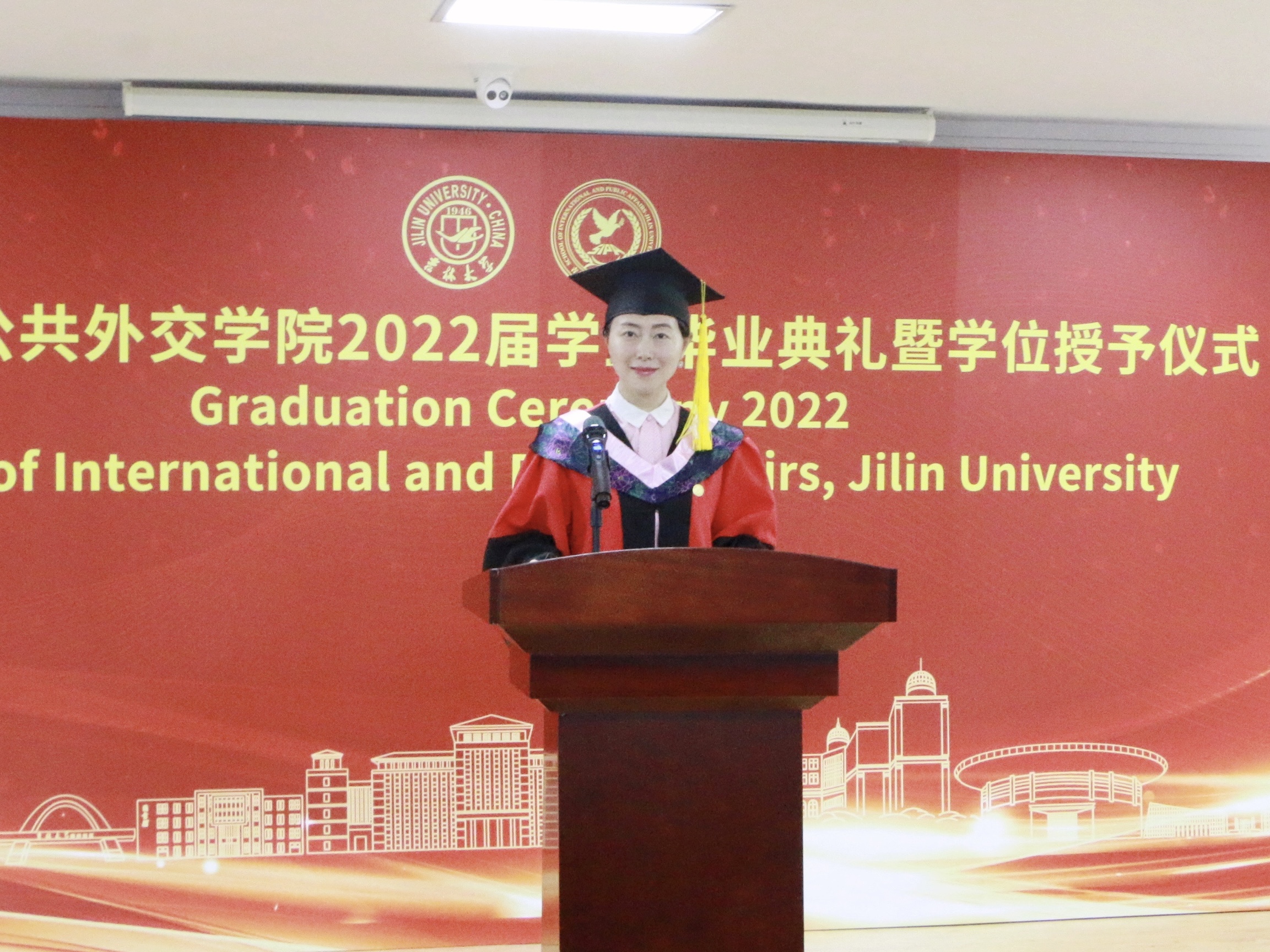 进入崭新的发展阶段。我相信,你们一定为之而感到深深自豪,这里永远是你们的家,留着你们青春的烙印,是你们梦想开始的地方……走出校门,你们要记得自己身上“人比山高,脚比路长”的吉大精神,“世界眼光,家国情怀”的SIPA精神,这些都是专属于你们的财富,让你们在面对不确定的世界时,有着一份确定的信心和底气。