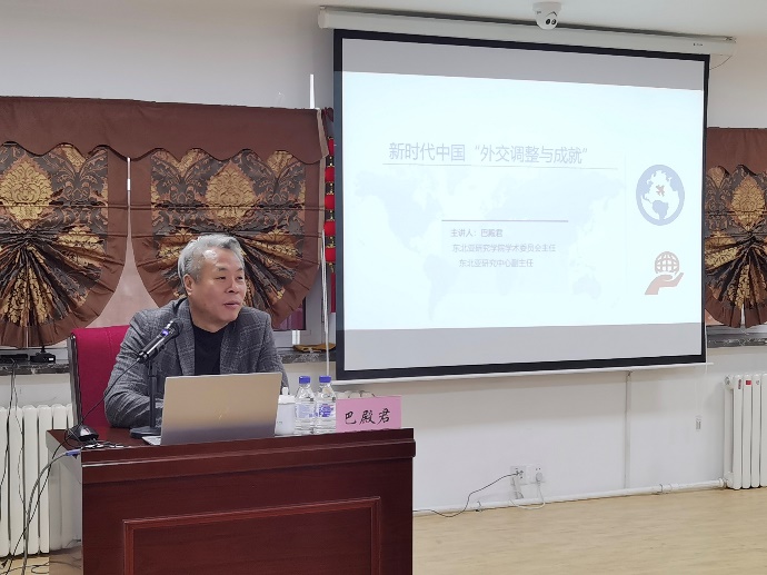 的学科特色,以新时代中国“外交调整与成就”为主题进行了宣讲。巴老师从国际秩序演进的角度系统讲述了冷战结束后的三个重要历史节点,以恐惧、屈辱、希望三种情感为切入点详细讲解了情感政治下百年未有之大变局,以一个战略方向、两个外交政策的重点指向、三个国家战略目标和四个外交原则分别阐释了中国外交政策调整与取得的重大成就。报告在最后部分,通过回顾新中国成立后的外交历程,总结了我国外交取得重大成就的根本原因在于坚持党的集中领导:不断学习与借鉴以往的成功经验与教训,通过积极促进“一带一路”国际合作,积极参与全球治理体系改革和建设,从而为推动构建人类命运共同体的实现提供助力。
