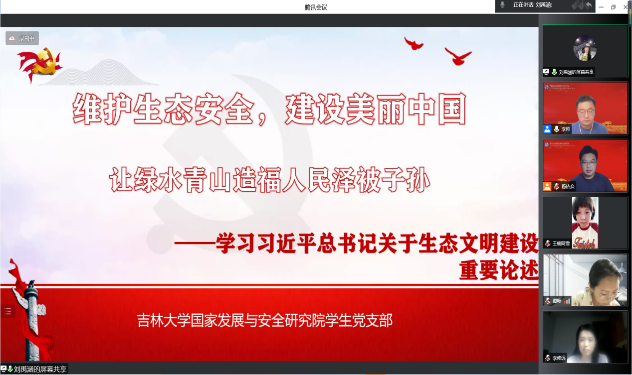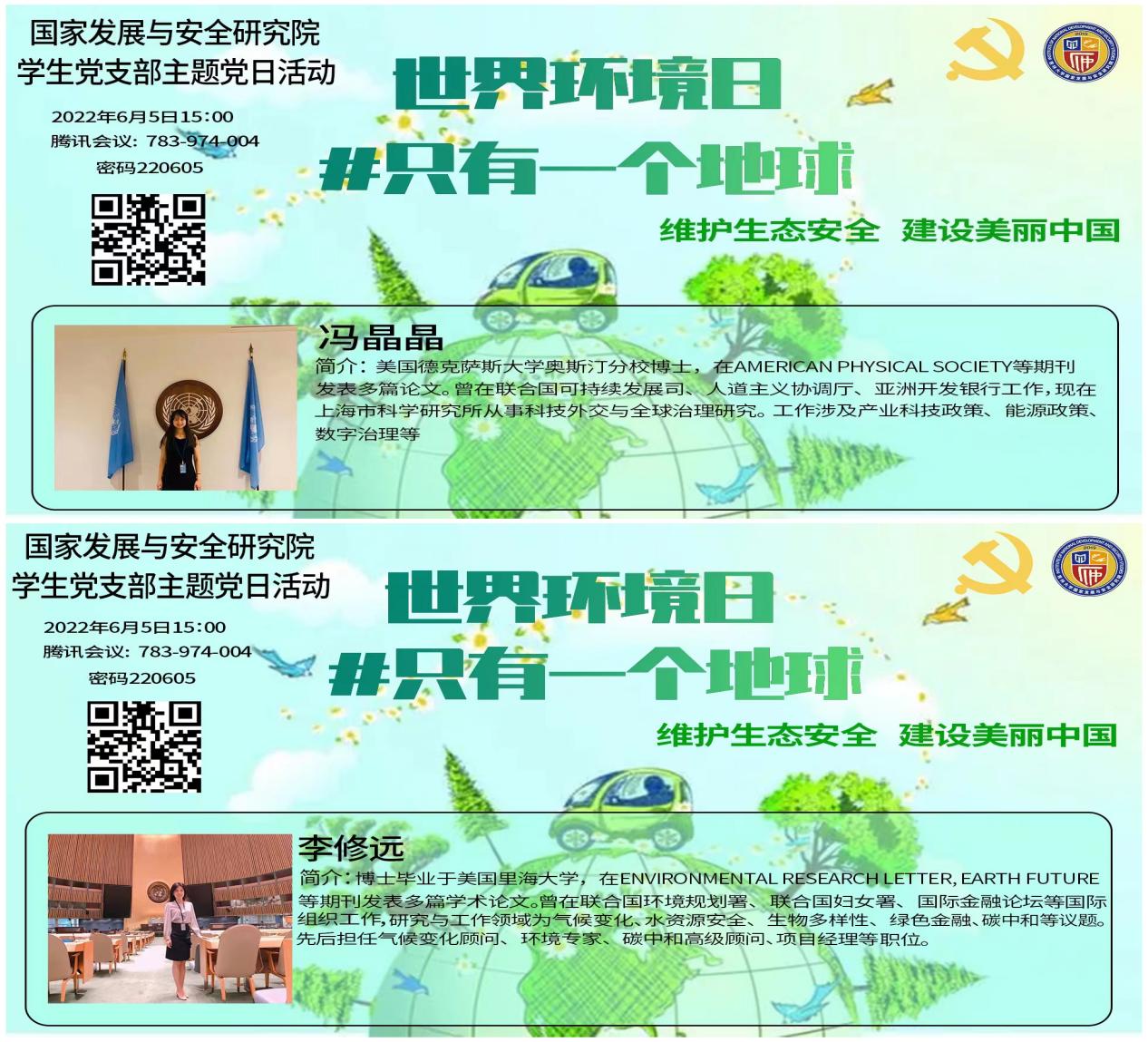 6月5日,国家发展与安全研究院学生党支部以“维护生态安全,建设美丽中国”为题召开线上主题党日活动。此次活动特别邀请原国际金融论坛环境专家、联合国环境规划署、妇女署顾问李修远博士和上海市科学学研究所研究员、原联合国可持续发展司职员冯晶晶博士后参会分享,赌博游戏