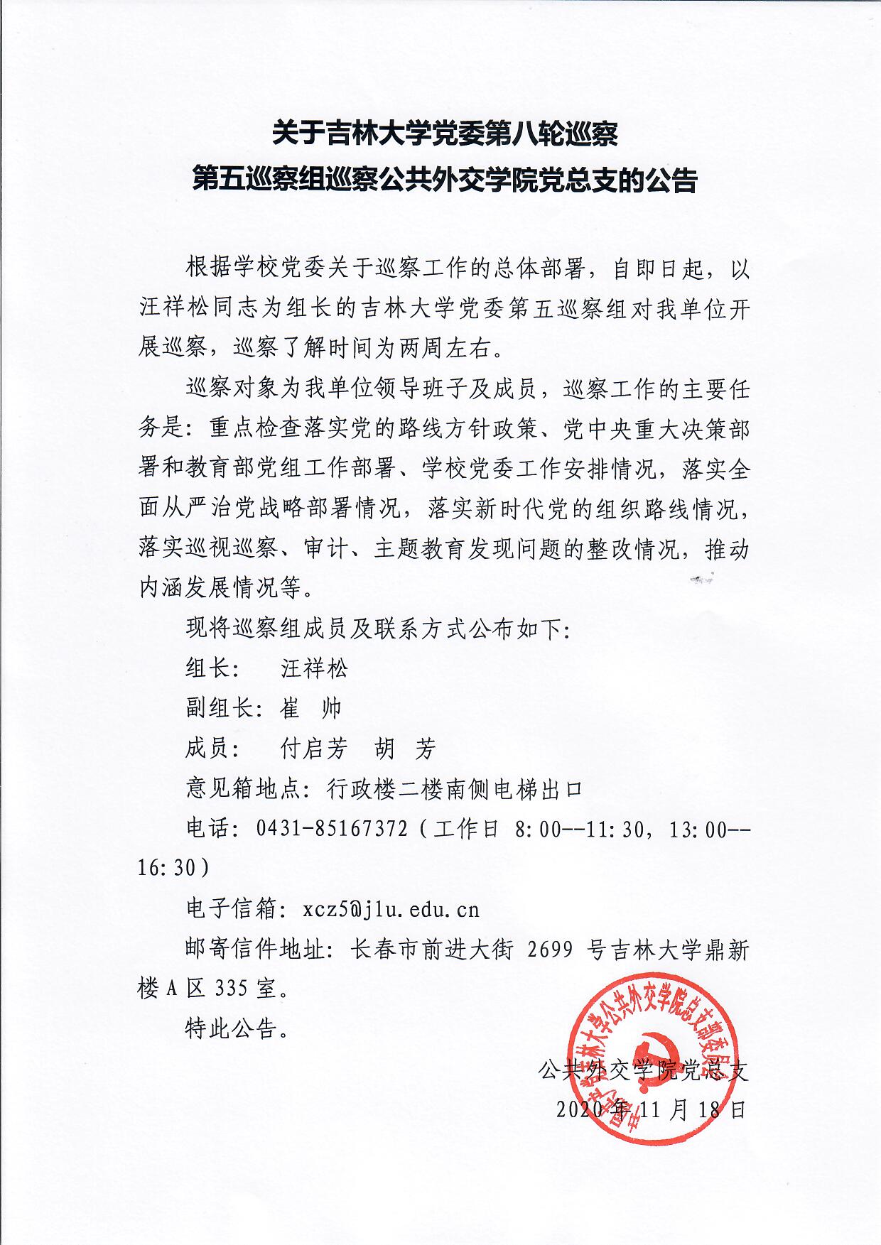 关于吉林大学党委第八轮巡察第五巡察组巡察赌博游戏 党总支的公告