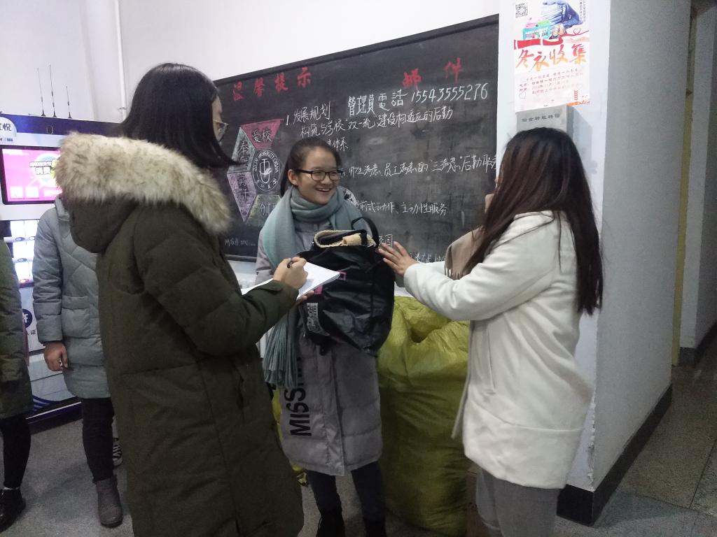 团委同爱心公益平台进行了衣物交接工作,这批带着学生爱心的衣物将被送往西南贫困地区,为那里的人们送去冬日里的一份温暖。