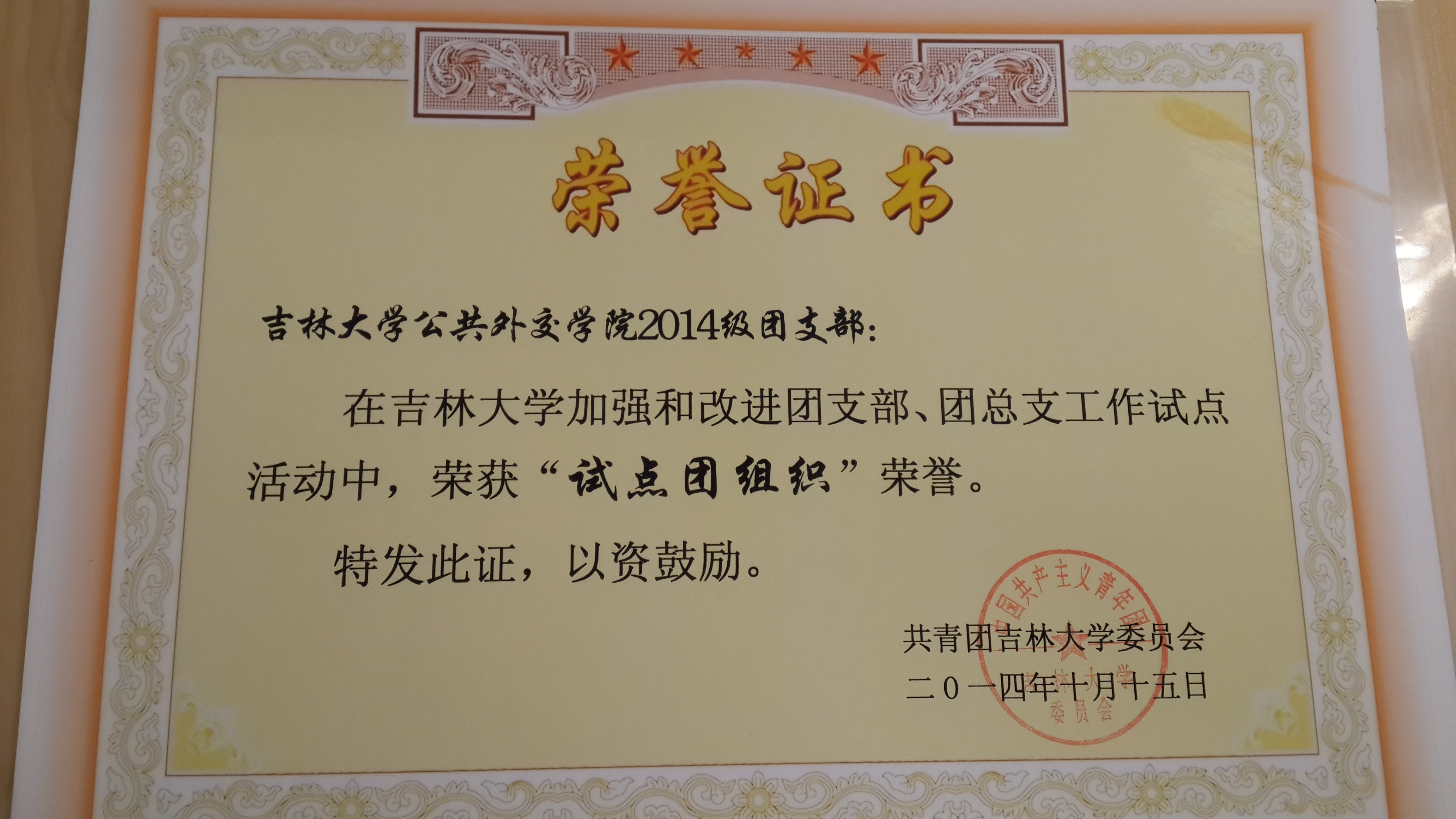的答辩获得了评委的一致好评,最终在吉林大学加强和改进团支部、团总支工作试点活动中,荣获“试点团组织”,并获荣誉证书。