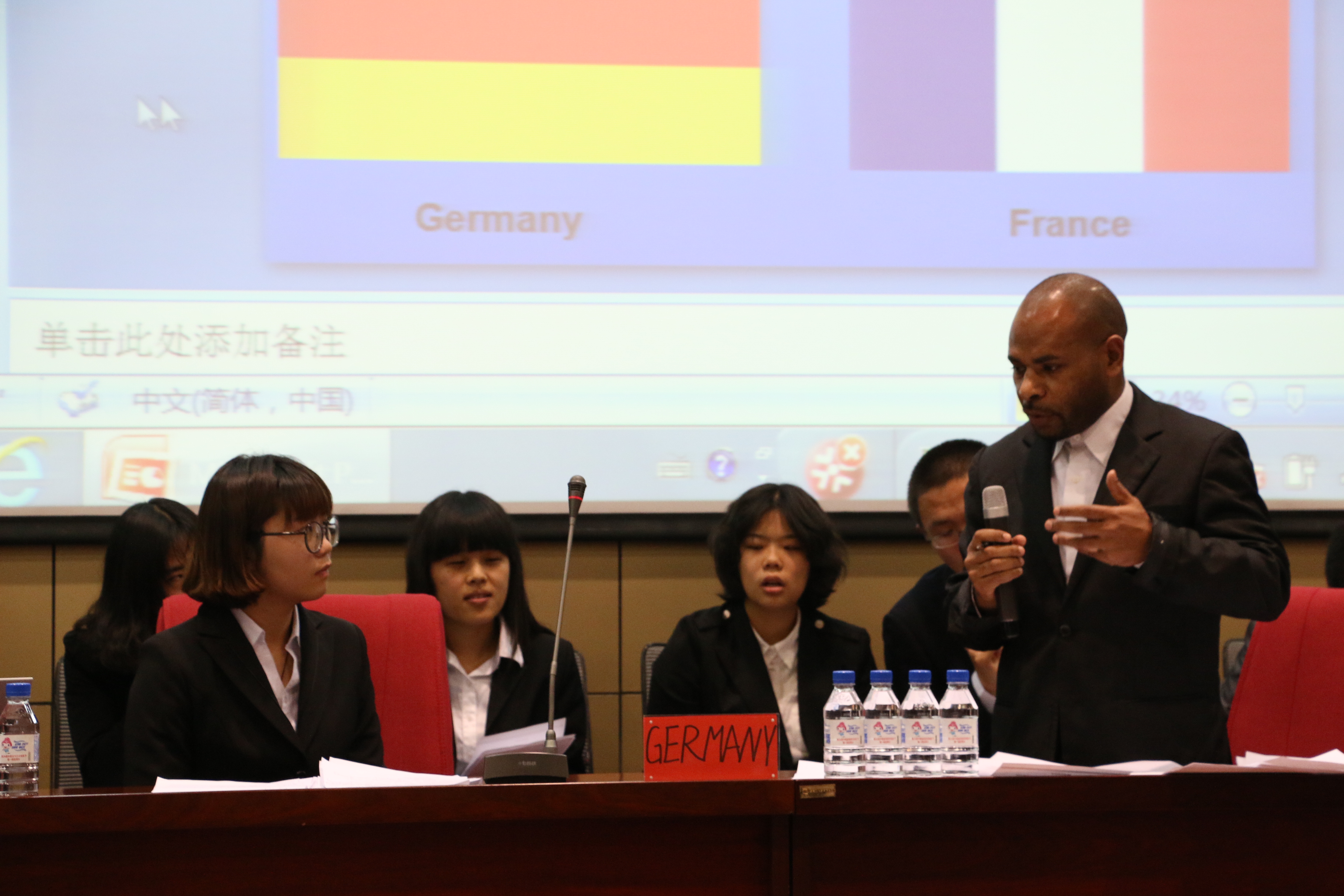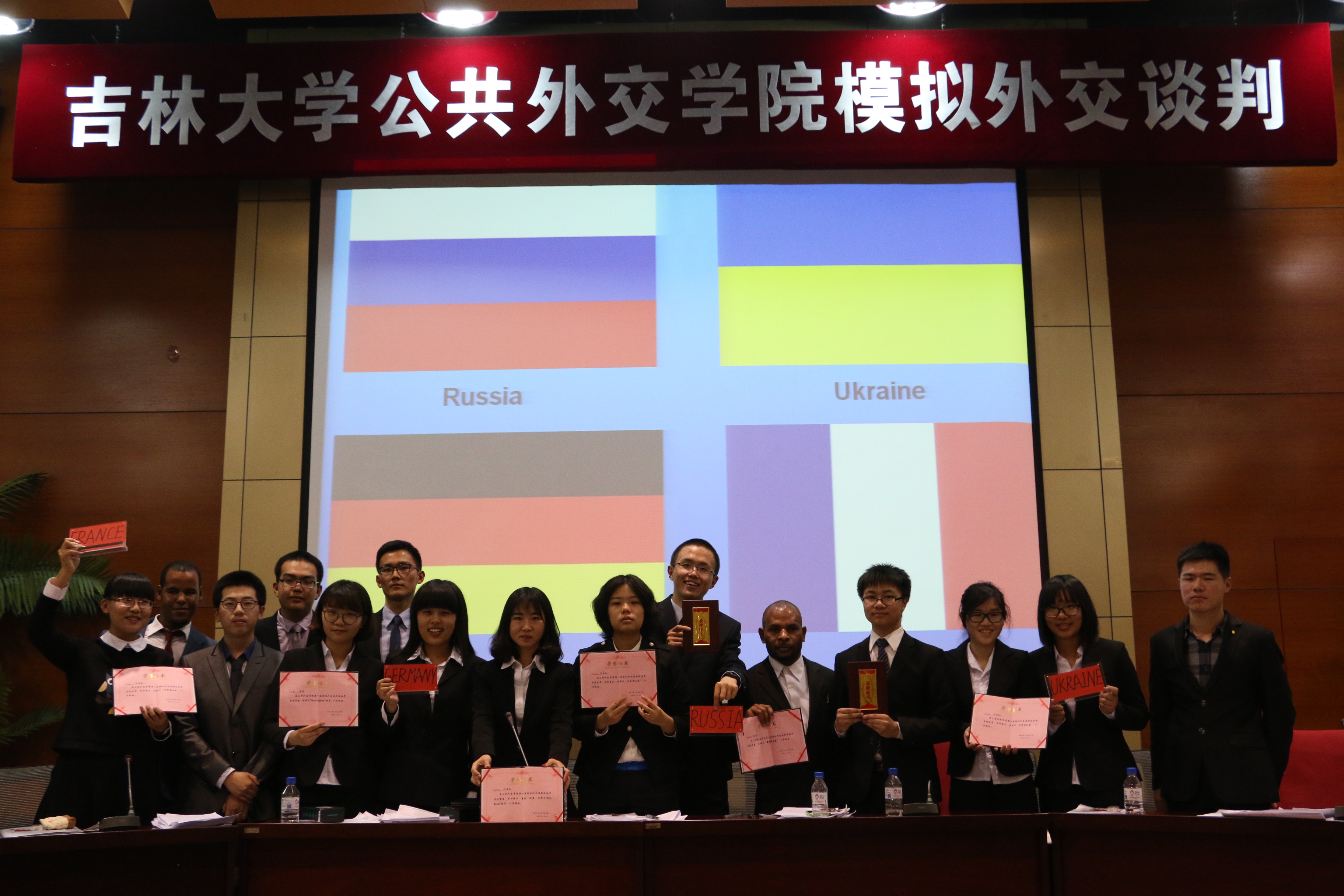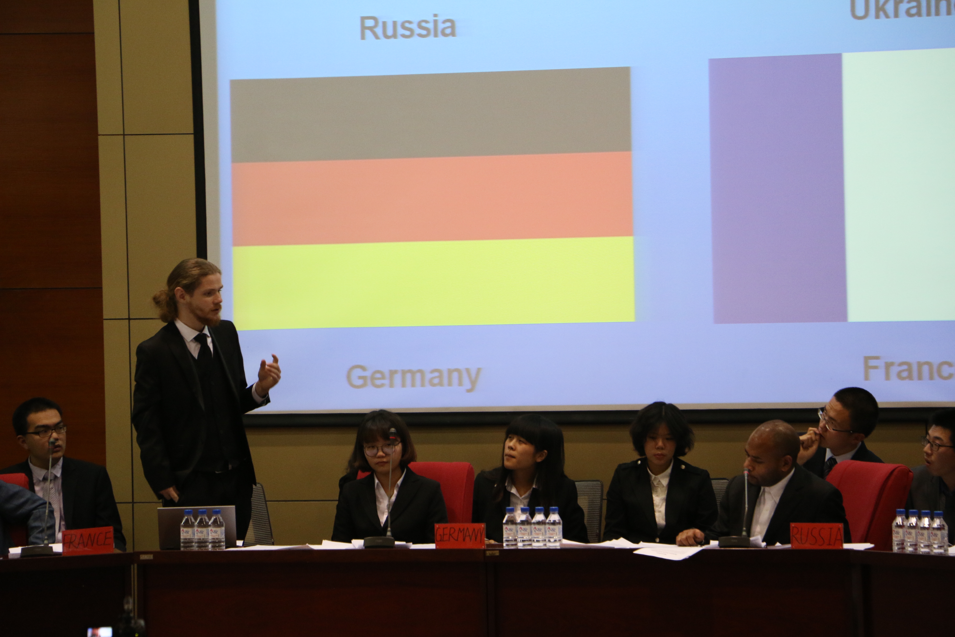 的同学16名同学组成了法国、德国、俄罗斯和乌克兰四国外交代表团,就既定目 标进行斡旋、争论、磋商,最终达成协议共识。谈判流程分为五个部分,分别为文件公示、立场阐述、各国质询、公开演讲以及经自由谈判后达成最终协议。本次活 动全程用英文进行,同学们在争论质询和自由谈判中挥洒激情,大大提高了外交英语的实际运用能力。