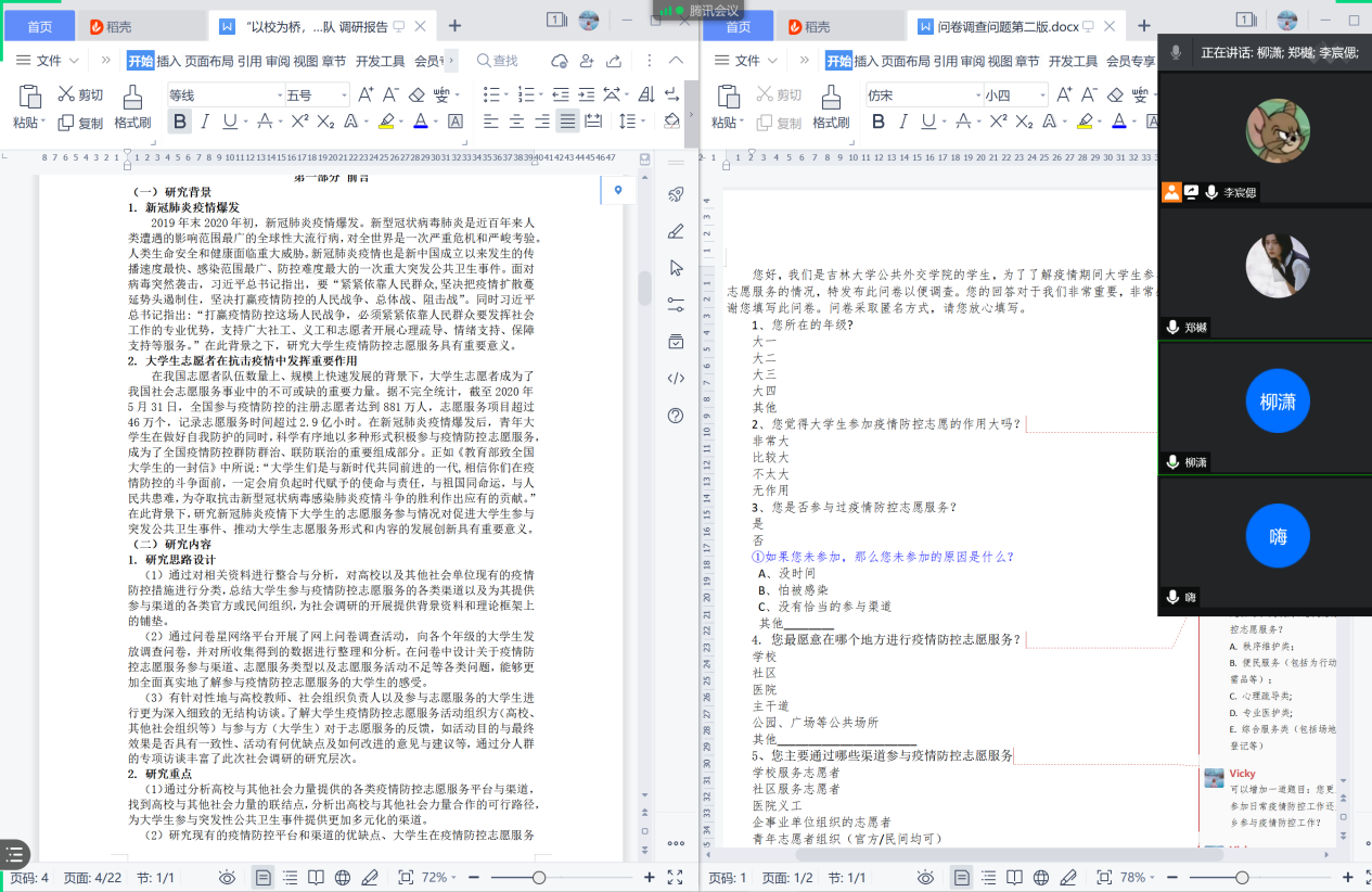 在这过程中,团队成员依托线腾讯会议平台,多次开展线上会议,制定社会实践计划,分享和汇报阶段性调研结果。在前期资料收集和文献分析的基础上,团队紧扣调研主题,面向全国高校大学生发放关于大学生参与疫情防控志愿服务情况的线上问卷,以掌握和获取具有较为普遍意义的样本数据。