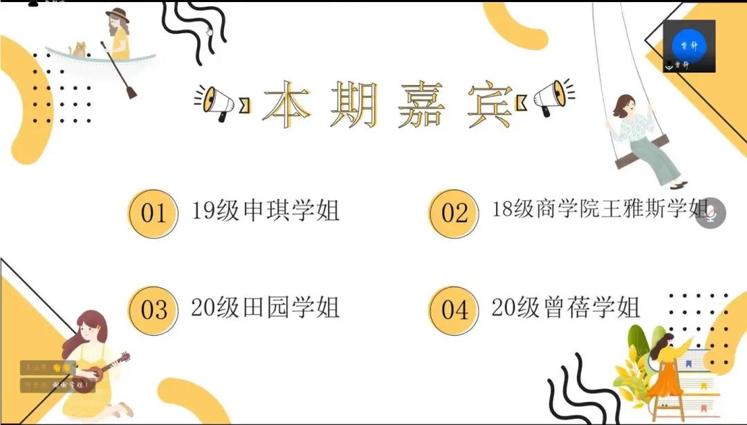 团委学生会学习发展部筹办了本学期第二期线上“青春分享课堂”活动。本次活动由21级本科生曾静主持,邀请到了19级本科生申琪、20级本科生曾蓓、田园和商赌博游戏