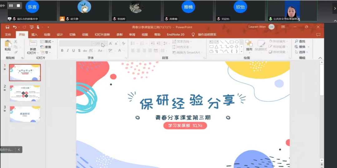 接着,余乐萌同学为大家分享了她的推免经验。结合自身经历,她建议同学们可以参考往年经验,做好前期的各类资料查阅工作。随后,她重点讲述了自己在国际组织实习的经历,鼓励大家积极参与,不断锤炼自我。分享的最后,她说道“每一个人都有自己的道路,即使一条道路不通畅依然有其他的机遇与可能”,希望同学们的人生道路永远是新奇与美妙的。