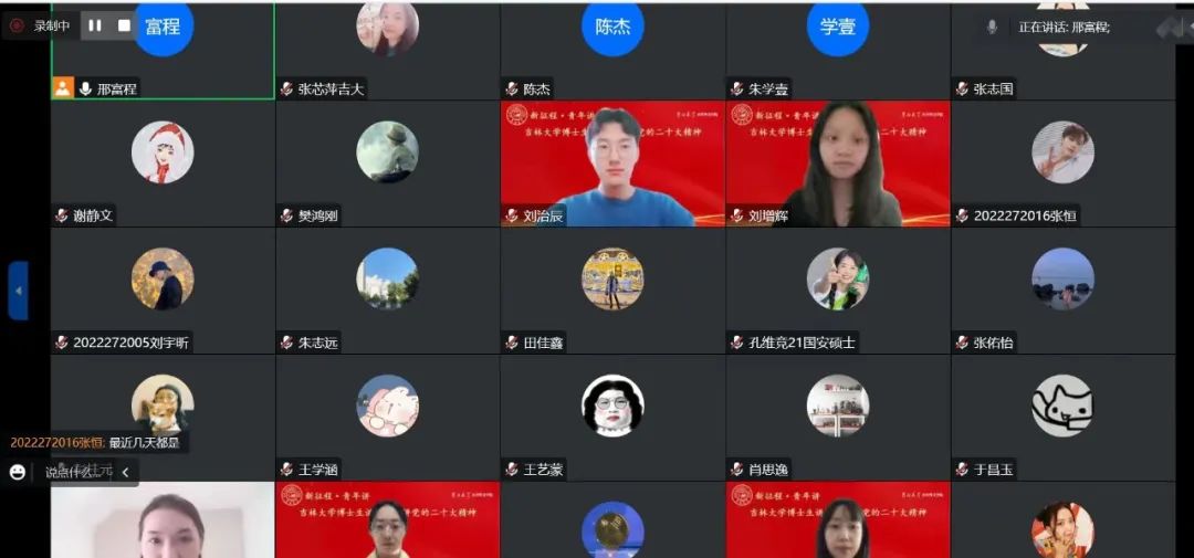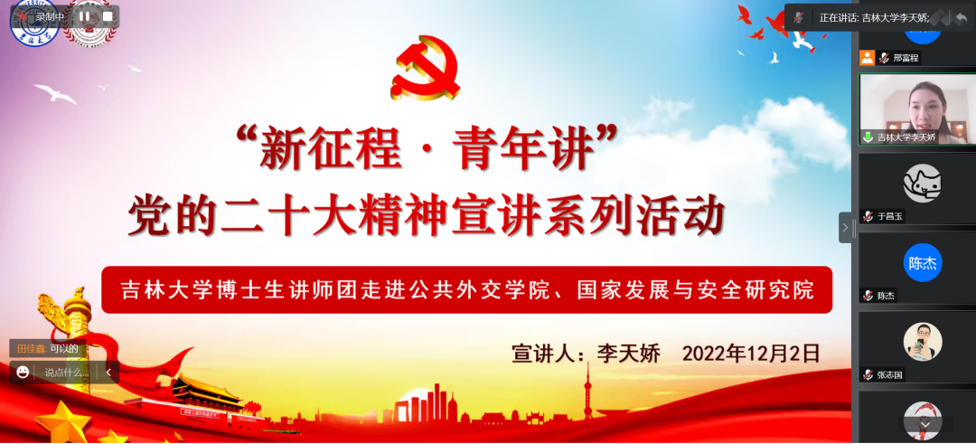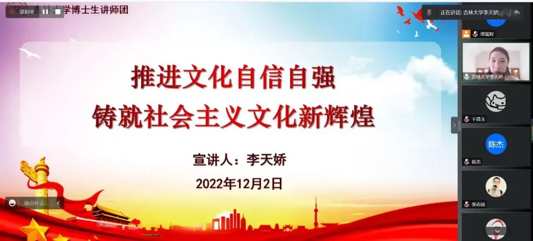 、国家发展与安全研究院特邀请吉林大学博士生讲师团讲师李天娇博士于线上开展党的二十大精神理论宣讲活动。本次宣讲的主题是“新征程•青年讲——推进文化自信自强 铸就社会主义文化新辉煌”。