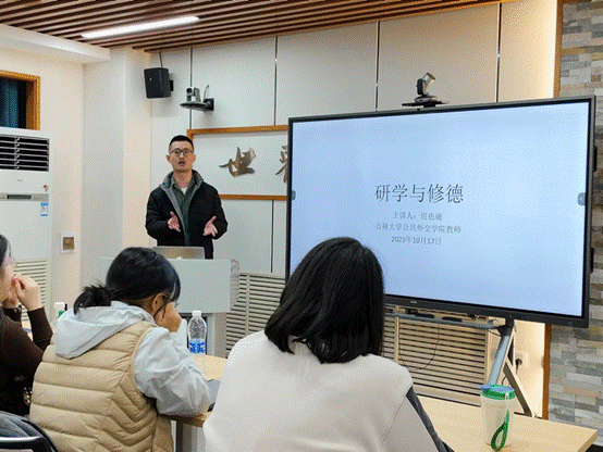 迟也迪老师主要从“研学”和“修德”两大方面展开分享。就研学方面,迟老师从学习、学生活动和生活三点入手向同学们分享了自己的经历和建议。他指出,大学是我们人生中很重要的一个成长阶段,同学们应当把学习放在第一位,讲求专业立身和思维能力的提升,才能更好地完成未来其他目标。同时老师提醒,大家也要平衡好学习和生活,积极参加活动以提升能力,学会与同学朋友和谐相处。在修德方面,迟老师强调,同学们要有良知,知礼仪,懂礼貌,努力提升自身涵养。同时也要胸怀家国情怀,培养自身独立思考、辩证思考的能力,并要崇尚科学。最后,迟老师以赵安之博士和肖清和博士的求学经历作结,借“历尽山河,仍觉人间值得”表达了对同学们的期望。