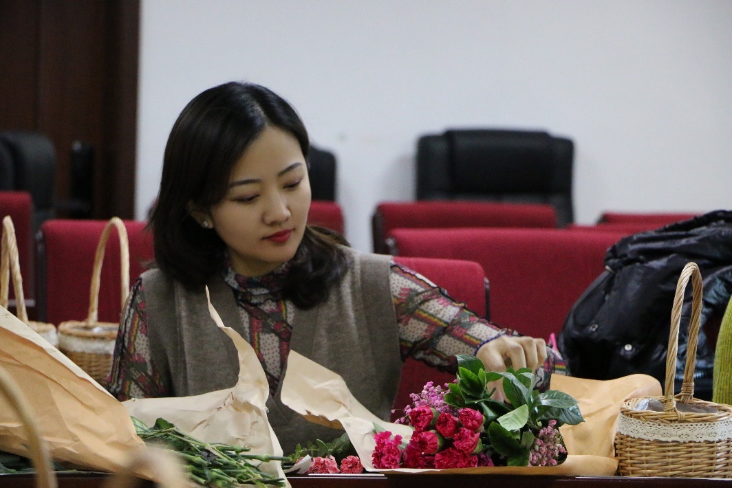 行政楼大会议室沁人心脾的花香中,周老师向参与活动的教师介绍了插花的发展历史,普及了鲜花和家庭盆栽的养护知识,详细讲解了插花的要领及技法,并进行了插花演示。置身于鲜花丛中的老师们兴致盎然,认真聆听老师讲解。